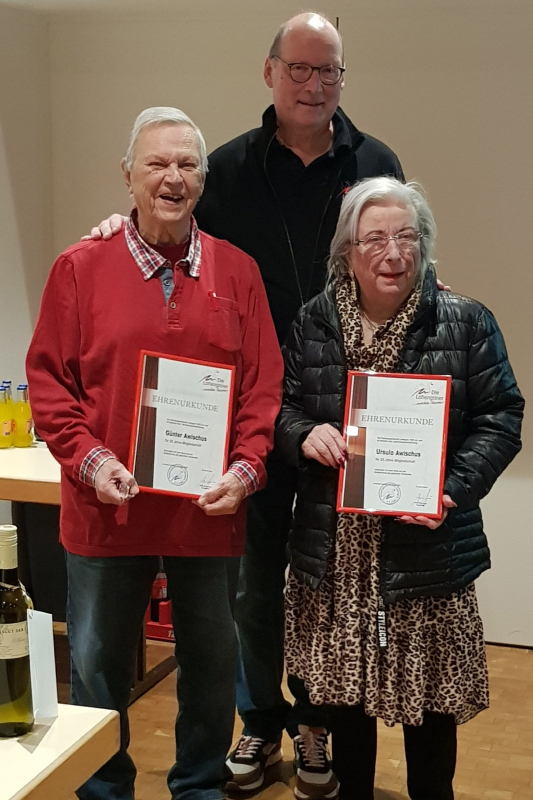 Erfreulich die anschließenden Ehrungen von langjährigen Mitgliedern. Hier waren es Inge Woitas, Ursula Awischus und Günter Awischus, die seit dem Jahr 2000 dem Verein angehören und somit für 25 Jahre Mitgliedschaft geehrt wurden. Armin Giebermann würdigte die Personen und ihre Leistungen für den Verein. Neben den zahlreichen Rollen auf der Bühne, wurde Usch Awischus im Speziellen für ihre 14-jährige Tätigkeit als Kassiererin und „gute Seele“ des Vereins geehrt.