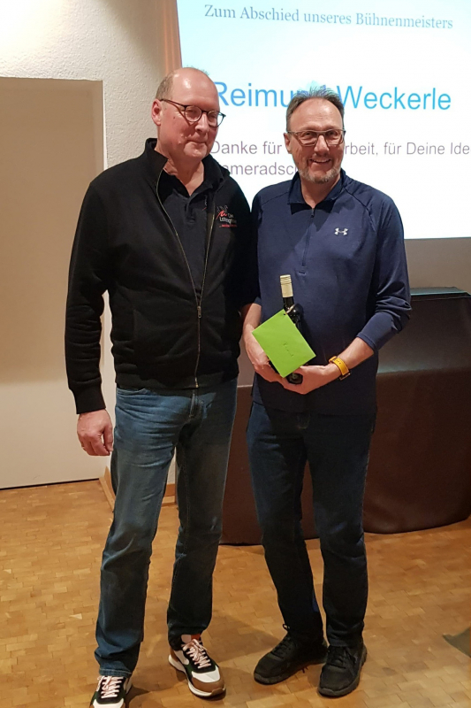 Reimund Weckerle legte das Amt des Bühnenmeisters nieder. Berufliche und private Veränderungen führen ihn von Wiesbaden weg. Armin Giebermann verabschiedete den langjährigen Weggefährten auf der Bühne und im Vorstand mit eine Präsent und Erinnerungen an die gemeinsame Zeit.
