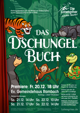 Die bekannte Geschichte von dem Dschungelkind Mogli. Als Baby im Dschungel gefunden und von Wölfen aufgezogen, lebt er viele Jahre später mit seinen Freunden Balu dem Bären und dem schwarzen Panther Baghira ein freies und wildes Leben. Der intrigante Affenkönig King Lui versucht, ihn zum Affenvolk hinzuziehen und lockt mit Spaß und Spiel. Der Tiger Shir Khan hegt einen alten Groll gegen das Menschenkind und stellt ihm nach. Die Schlange Kaa ist gefährlich, erweist sich aber doch letztlich als guter Freund. So hat Mogli einige Abenteuer auf der Lohengrin-Bühne zu bestehen.