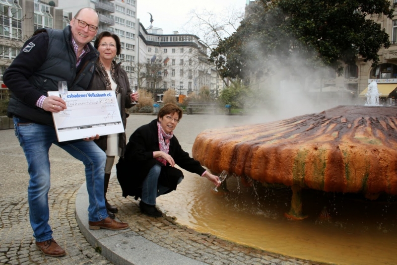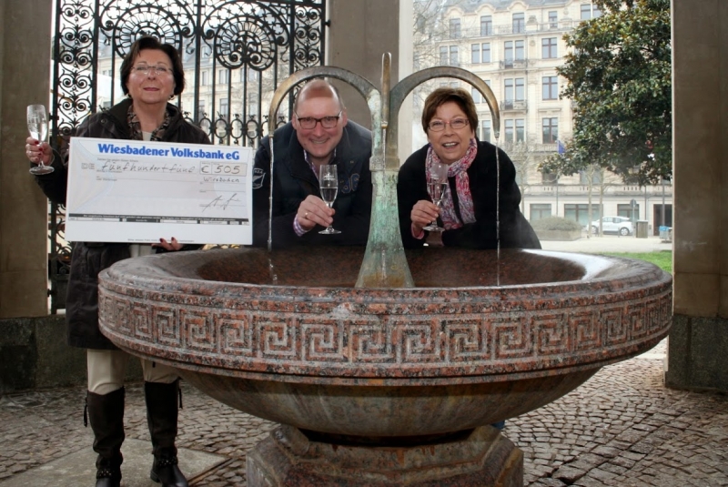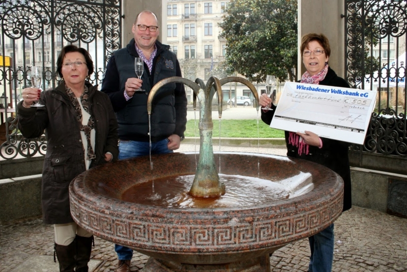 Da genehmigen sich die drei Lohengriner doch gerne ein Schlückchen des guten alten Kochbrunnenwassers. Vielleicht hat es dieselben magischen Kräfte wie „Der satanarchäolügenialkohöllische Wunschpunsch“, den die Zuschauer anlässlich der beiden Vorstellungen des Kinderstücks genießen konnten. In die Spendenkörbchen wanderten auf wundersame Weise 505 EUR, die auf das Konto der Wiesbadener Schulpaten gezaubert wurden.